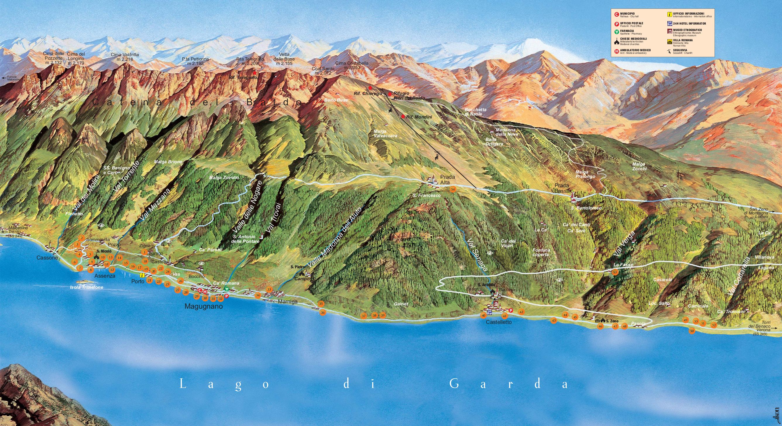 Il sistema funiviario parte da Prada: un’amena stazione turistica situata spettacolare terrazza del Monte Baldo, a circa 1000 metri sul livello del mare, che si specchia sul Lago di Garda, si espande sul territorio di due Comuni: San Zeno di Montagna e Brenzone.